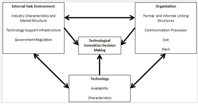By technological context, an institution considers the internal and external technologies that are essential and relevant to the day-to-day running of the institutional core services or activities. The organizational context refers to the features and resources possessed by the institution that can influence the decision to adopt technological innovations; this includes the strength or size of the institution, level of centralization, managerial structure, and human resources at its disposal, among others. The environmental context has to do with the scope and structure of the institution, the institution’s competitors, and the supervisory environment (Tornatzky & Fleischer, 1990).