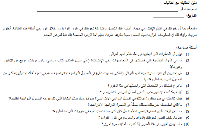 Thus, two instructors taught the reading passages in the textbook Q Skills for Success Reading and Writing Intro to the EG following the think-aloud strategy while the CG was taught simply what was mentioned in the prescribed textbook. The researchers interviewed the two instructors who taught the EG a day after the experiment was over. These were semi-structured interviews using ten guiding questions, (Appendix A), each session lasted around 50 minutes. This method was adopted based on the assumption that the interview is one of the best methods of getting an in-depth and profound description of the instructors' perceptions toward reading in a virtual classroom.