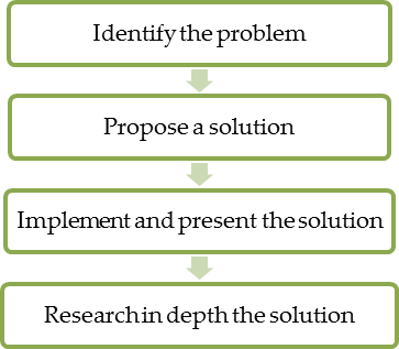 Step 3: Implement and present the solution. Of the options proposed in Step 2, students choose an appropriate option to work on to resolve the problem. This option must satisfy the problem-solving requirement and be more optimized than the other alternatives (faster problem-solving, more straightforward solutions, fewer chances of error). Moreover, students need to present solutions closely and clearly. If the planned results are not appropriate or the answer is not feasible, students must check Step 2 to see if the option was reasonable. Once students have chosen the appropriate plan and found the right result, the problem-solving ends here.