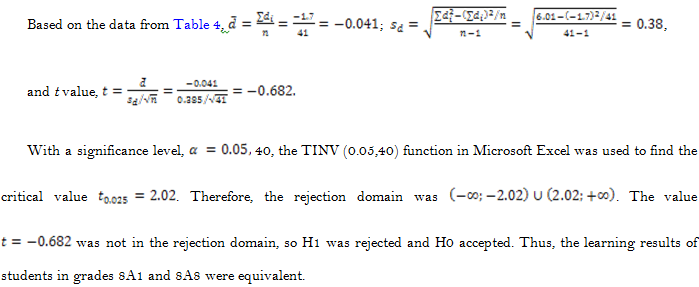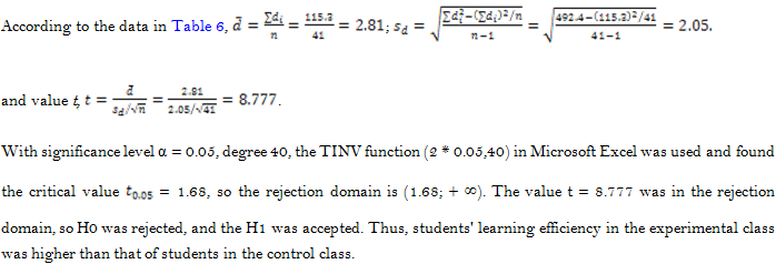 Thus, after the experimental class received the pedagogical impacts towards problem-solving capacity development, the component competencies such as the capacity to explore the problem, collect information from the practical situations; the ability to convert information from practical situations about the mathematical model; capacity to seek strategy for solving mathematical models; the ability to execute solving strategies to find results. The student's ability to change from solving mathematical models to addressing real-world problems had significantly improved compared to the situation before the experiment (when students solved problems in experimental activities). Additionally, students demonstrated considerable leadership and initiative in making plans, working together, and developing novel solutions to problems. The above results showed that the proposed measures were useful, contributing to the development of problem-solving capacity and stimulating the spirit and sense of learning for students. This result could confirm the feasibility and effectiveness of the study.