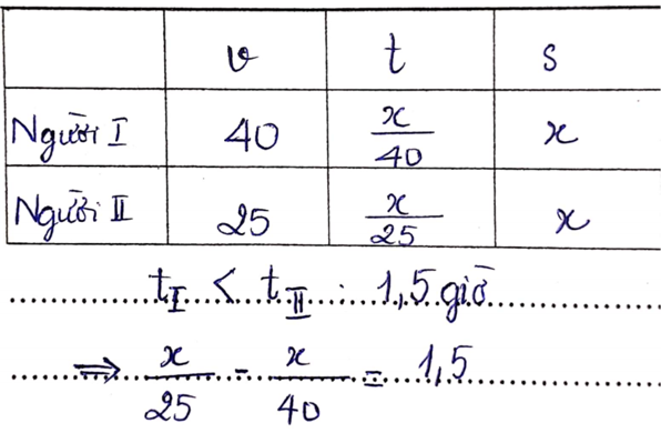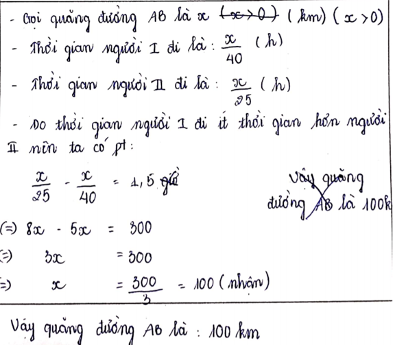 Problem: "Two people go from A to B; the first person travels at 40 km / h, the second person travels at 25 km / h. To go all the way to AB, the first person needs 1 hour and 30 minutes less than the second person. Calculate distance to AB."