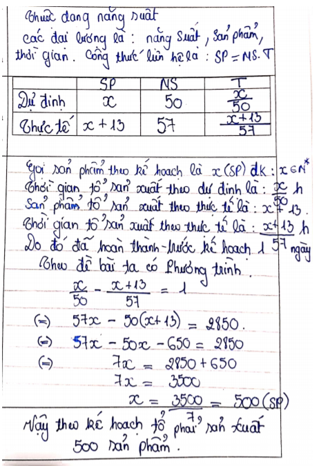 Problem 1: A planned production team must produce 50 products per day. When implementing, the team produced 57 products a day. Therefore, it completed one day ahead of schedule and even exceeded 13 products. How many products does the team have to produce according to the plan?