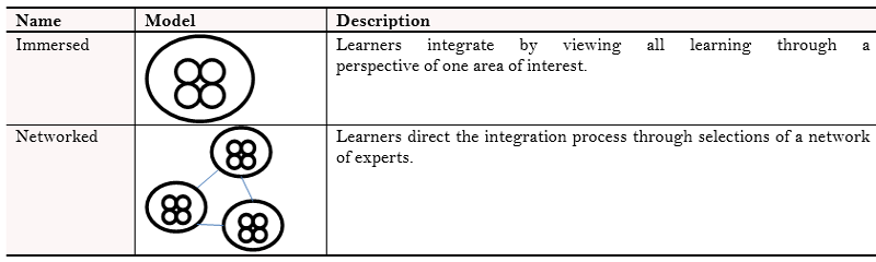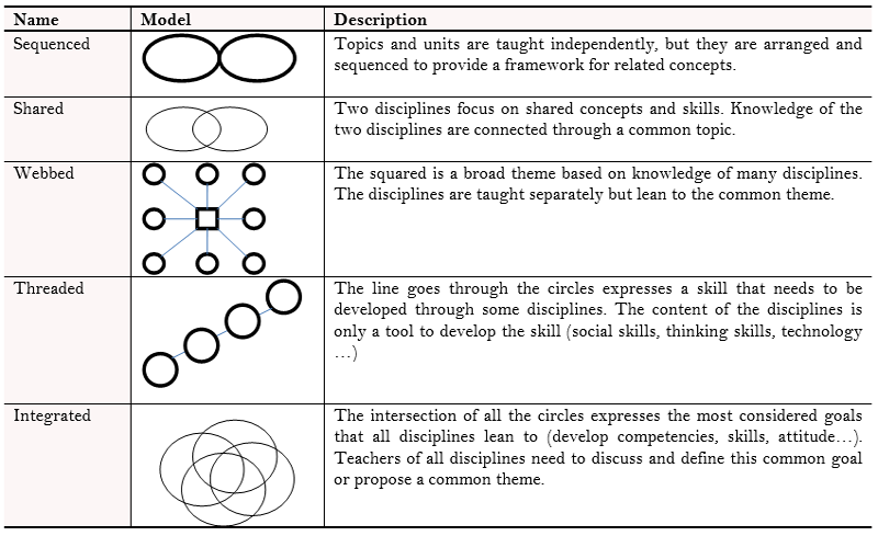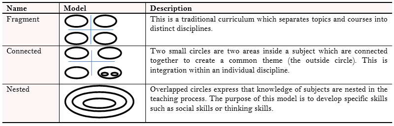 In addition to the integrated models of Vars, Fogarty and Drake & Burns, other methods and degrees of integration are also mentioned. Jacobs (1989), for instance, established 5 levels of integration, which are parallel disciplines, multidisciplinary, interdisciplinary, integrated day, and complete integration. Gresnigt et al. (2014) distinguished six approaches to integration with the increasing degree of integration, which are: isolated, connected, nested, multidisciplinary, interdisciplinary, and transdisciplinary.