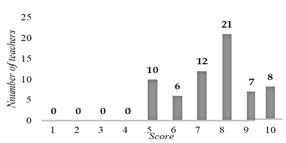 Responses about the importance of integrating content and language teaching in physics were collected on a scale from 0 to 10. The results obtained are shown in the graph in Figure 3. The graph shows all participants with a rate more than 5 points, with point 8 representing the highest number with 21 teachers, accounting for 32.8% of the sample.