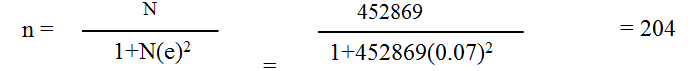 e = the level of precision, e= level of precision/sampling error at 0.07
