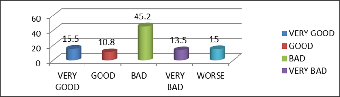 Figure 4 below shows the percentage distribution of the responses of the respondents to the condition of roads connecting the markets to the various villages.15.5% of the respondents agreed that the condition of the roads connecting markets to villages are very good, 10.8% agreed that the roads are good, 45.2% says the roads connecting market to village are in bad condition, 13.5% agreed they are very bad, while 15% agreed that the roads are in a worse condition. This indicates that it is obvious that so many commercial vehicles will decide not to ply that route to avoid vehicle damage, and cost of product carriage will be negatively affected.