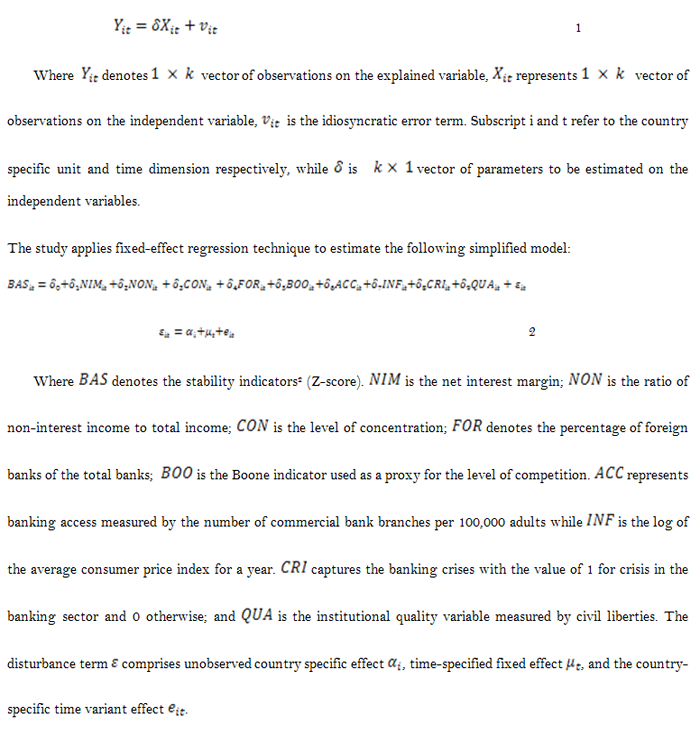 This study provides its uniqueness from past studies in the following: First is the use of a country-level dataset, which offer a comprehensive understanding of factors that influence the stability of the entire banking sector. Furthermore, the entire stability can better be evaluated at the aggregate level rather than at the micro spectrum. Therefore, assessment of the bank stability is carried out using aggregate variables in ECOWAS countries. Second is that the study examines banking crises in each commercial bank as well as approaches employed to mitigate the crises. Third, it applies Z-score for measuring banking stability. Fourth, it examines the impact of institutional quality of the stability of the industry. Fifth, it employs a fixed-effect estimation technique to ensure robust results. Sixth, it investigates all these links concomitantly as well as their effect on stability. Up to now, little or scanty research has been done in this aspect.