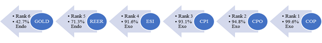 Thus, from here, we can conclude that the spot Kijang Gold prices is the less exogenous and lagging real effective exchange rate, Islamic stock market prices, inflation rate, crude palm oil and crude oil price. This means that the Kijang Gold prices are lagging and mainly influenced by Islamic stock market, macroeconomic fundamentals and strategic commodities respectively.