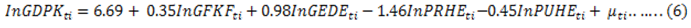 The Levin-Lin-ChuUnit Root Test results above show that, all the variables are stationary with LGDPK, LGEDE and GFKF being stationary at level while PRHE and PUHE are stationary after first difference. On the basis of this, we reject our null hypothesis that Panels contain unit roots and conclude that the Panels are stationary. Also, the Im-Pesaran-ShinUnit Root Test results above show that, all the variables are stationary after first difference with only LGEDE being stationary at level while LGDPK, PRHE, GFKF and PUHE are stationary after first difference. On the basis of this, we reject our null hypothesis that all panels contain unit roots and conclude that some panels are stationary. This indicates that our variables can be used for further regression or estimations.