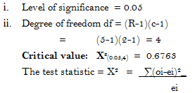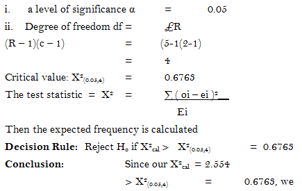 Decision Rule: Reject H0 if X2cal is greater than X2(0.05,4) = 0.6763, otherwise do not reject Ho.