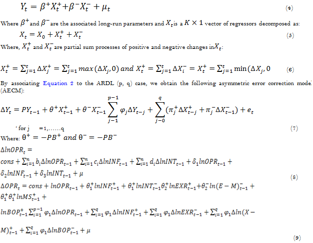 The ARDL Bounds test approach to cointegration is based on the ordinary least square (OLS) estimation of a conditional unrestricted error correction model (UECM) developed by Pesaran et al. (2001). This approach is applied to ascertain the existence of a long run relationship and for the estimation of long and short run coefficients. From the ARDL approach, we can derive a dynamic error correction model (ECM) following a simple linear transformation, where the ECM integrates short run dynamics with long run equilibrium without losing long run information. In order to implement the bounds testing procedure, it is necessary to model Equation 1 and Equation 2 as a conditional ARDL as in Shin and Pesaran (2011) in the following form: