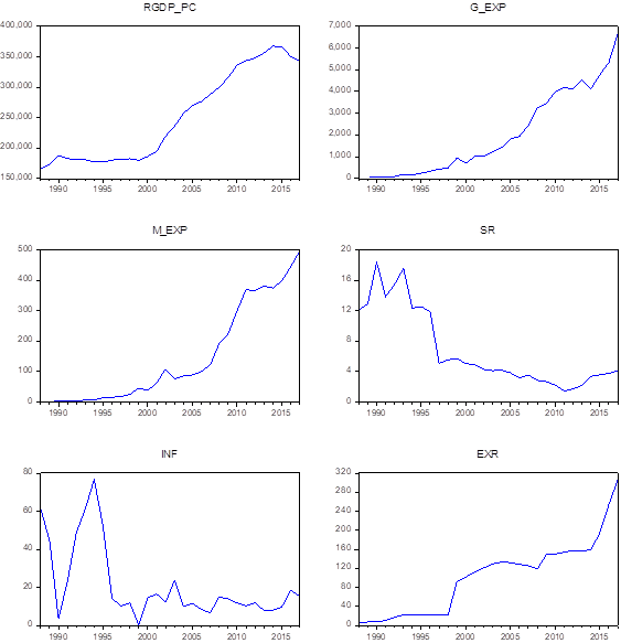 The study used annual data from 1988 to 2017. The set of variables used were the real gross domestic product per capita (RGDP_PC), total government expenditure (less military expenditure) (G_EXP), military expenditure (M_EXP), savings rate (SR), inflation rate (INF) and the exchange rate (ER). The military expenditure was derived from the total government expenditure because of the significance of each of the variables in the study. This enabled us to know their individual impact on the dependent variable.
