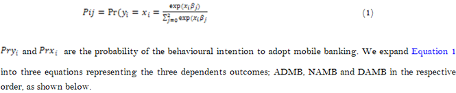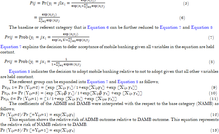 Equation 2 represents the probability that the ith consumer will choose alternative j (j = 1, (ADMB), Equation 3 shows that there is probability that a consumer will select NAMB outcome. Equation 4 is the consumer’s behavioural intention to probably select the outcome DAMB. Z’i are a consumer’s-specific regressors such as; age, gender, perceived ease of use, perceived usefulness, social influence, self-efficacy, level of education, compatibility, trialability and among others, that are thought to explain the consumer’s decision to adopt mobile banking. The elasticities 1,