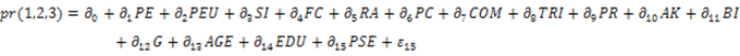Y*ijt is consumer behavioural intention of individual i to individual j in time tm and is a variable with three possible outcomes. X*ijtm is a vector of N explanatory variables such as firm perceived ease of use (PEU), perceived usefulness (PE), perceived self-efficacy (PSE), social Influence (SI), facilitating conditions (FC), perceived complexity (PC), compatibility (COM), trailability (TRIAL), perceived Risk (PR), Awareness Knowledge (AK), Behavioural Intentions (BI), gender (G), marital status (M) and education (EDU).