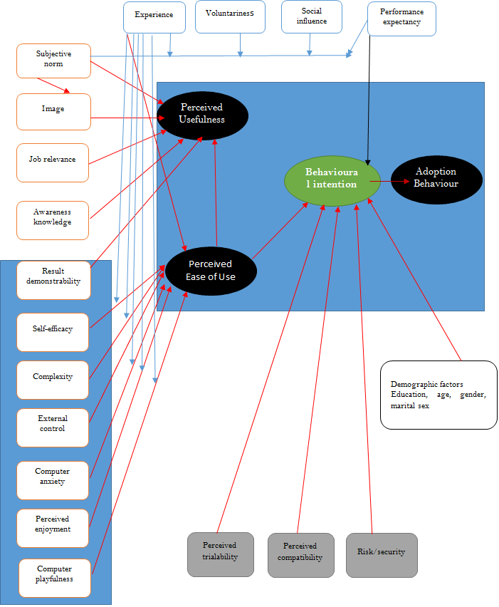 | Unified theory of acceptance and Use of technology (UTAUT) | Behavioural intention, Behaviour | Performance expectancy, effort expectancy, social influence, facilitating conditions | Adopted from TRA, TAM,TPB, Motivational Model (MM), SCT,MPCU |