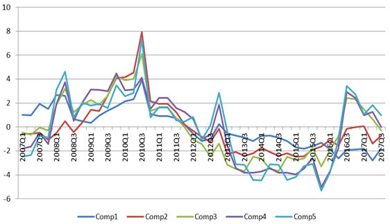 Following the selection of the five principal components as the new indexes, we compute their scores for each quarter. The quarterly change in trend among the scores of the first five principal components is shown in Figure 2. The chart indicates a co-movement among all the principal components scores suggesting a substantial degree of correlation.
