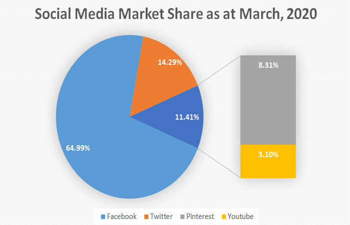 In 2004, the first social media site to reach one million active users was Myspace which had competition from the likes of Facebook but some years along the line, it is the opposite story. Most social media platforms that exist about a decade ago are not active lately. In relevance, Facebook has occupied the largest space of social media penetration as it has the largest market share. According to Statcounter (2020) Facebook has a market share of 64.99% followed by Twitter 14.29%, Pinterest and YouTube have 8.31% and 3.10% respectively see Figure 1. In 2009, Facebook had a market share of 48.14% and as at March, 2020 has increased its market share by 74.07% to 64.99%, Pinterest has increased its market share by 8.31% and Twitter has also increased its market share by 50.5%. The rapid increase in social media penetration sparks fears in relation to the negative effects that could possibly arise as a result of their usage. These negative effects could range from psychological and economic impacts. However, this study resonates on the argument whether there is a link between economic growth and social media.