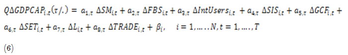 In Equation 6, α1 to α6 represents the coefficients of the parameters to be estimated, ∆ stands for the different quantile levels for each variable, i represents the cross-section of the countries in the panel, β represents the error term and t represents the time period of 2009 to 2017. Again, SM represents social media, FBS represents fixed broadband subscription, IntUSERS stands for internet users, SIS represents secure internet servers, GCF represent Gross capital formation, SET represents school enrolment in tertiary education, L represent labour participation rate and TRADE refers to trade openness.