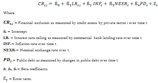 The study used fixed effects panel data regression analysis to examine whether interest rate ceilings contributed to financial exclusion in Kenya especially credit to private sector. The results from the study exhibited a positive and statistically significant relationship between interest rate cap and credit access inferring that interest rate controls affects credit access leading to financial exclusion in Kenya. The results for inflation rate showed a negative but statistically significant relationship between inflation and financial exclusion implying that inflation affects loan expansion. The results for exchange rate and public debt are statistically insignificant, suggesting that they do not have an effect on credit access in Kenya’s commercial banks.