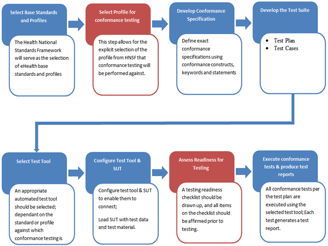 This study resulted in the development of an eight-step process model for conformance testing of health information systems, as summarised in Figure 6. Blocks in red indicate steps that were included as a result of the expert review evaluation process.