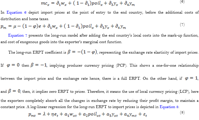 Following Campa and Goldberg (2005) model on ERPT, this paper adopts a micro-based partial equilibrium mark-up model which incorporates some general equilibrium aspects at aggregate price levels. We extend the model by including the impact of domestic costs of the importing country. The import price Pm of a nation can be presented asφ lies between 0 and 1. If φ = 0 it implies producer currency pricing (PCP), meaning change in exchange rate does not affect the price. Whereas if φ = 1, it implies local currency pricing (LCP) meaning the change in the exchange rate is fully transferred to the price with on effect on the mark-up assuming the marginal costs are fixed. The μ in Equation 5 stands for constant. To make it simpler, Equation 5 eliminates the effect of other factors, like demand pressure in the local economy. The Equation 6 is a log linearised form: assuming the exporter’s marginal costs increases by a weighted average of market wage wx; with other prices such as oil prices, poilx, and the demand pressure in the exporting country, yx, and the demand pressure in the local market, ym.