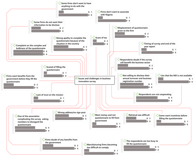 The field workers were asked if there are any challenges they faced on the field during the data collection. The majority of the respondents said the firms' complaints on the bulkiness of the instrument. Next to the complaints about the instruments' bulkiness is that the firms are not willing to disclose the annual turnover and business registration number as requested from the questionnaire. More so, the fieldworker discovers that the respondents were too busy to attend to such a survey. Also, one of the associations is discouraging the firms registered under them to fill the questionnaire. There is an issue of the wrong address or no signpost to identify the firm in their location. Also, the respondents have strong apathy to complete the questionnaire because of the situation in the country. Themes that were identifies were shown in Figure 1, and some of the excerpts are highlighted below.