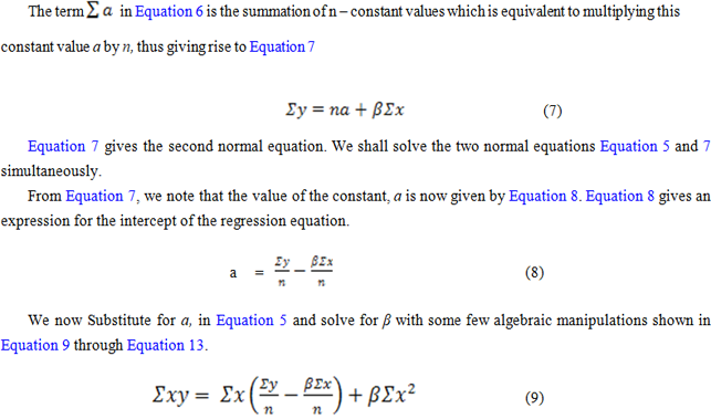 The task here is to find the values of the constants a, and b in order to make the equation complete. We can find the values of a, and b using least square method as indicated in Johnston and DiNardo (1997) and many other literature on statistics. Let’s consider Equation 1 for further analysis.