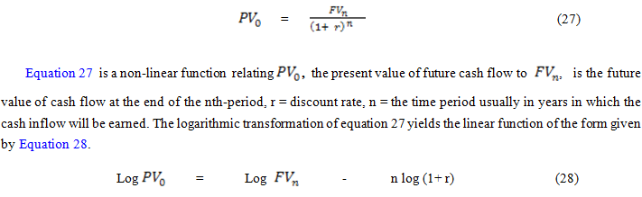 Equation 28 demonstrates a possibility of the time series regression of logged present value of future cash flows on the time period, n. Depending on the type of data available, we shall show that the regression of the linear relationship in equation 28 can solve a number of practical problems in finance and accounting decisions.