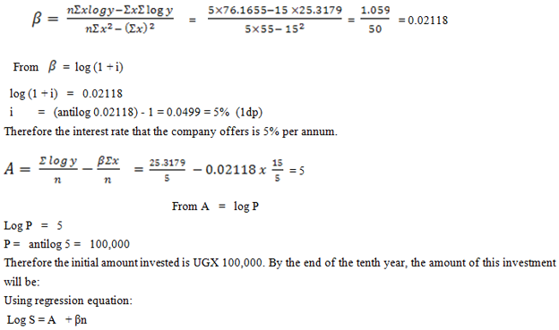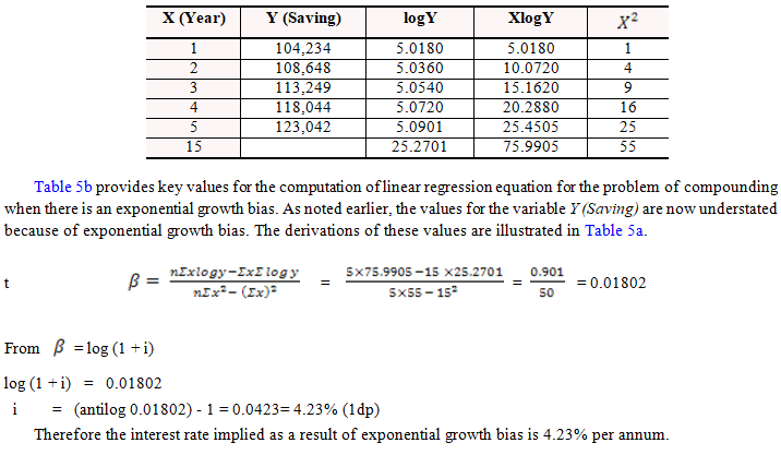 Table 5a shows the growth of an initial investment perceived by an investor with exponential growth bias. Compared to an unbiased exponential growth shown in Table 3, an investor with an exponential growth bias parameter, λ = 0.15 at an interest rate of 5% compounded annually, will perceive a lower growth in future value. For instance, without bias the future value at the end of year one is UGX 105,000 but an investor with exponential growth bias of λ = 0.15 will perceive a future value of only UGX 104,234 at the end of the first year. We shall regress exponential growth bias data in Table 5a on time as regressor. The detailed solution is given in Table 5b below: