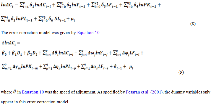 Following Pesaran, Shin, and Smith (2001), Equation 7 was estimated using ARDL bounds test procedure by modelling it as an error correction model specified as