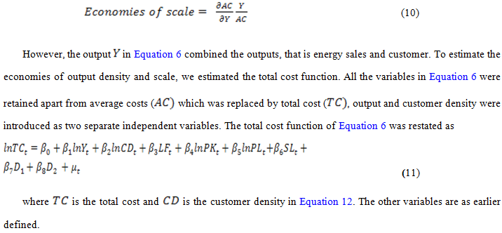 Economies of scale exist if the elasticity of average cost with respect to output is negative, that is if an output expansion results in lower average costs. The elasticity of average cost with respect to output is given by Equation 11 as