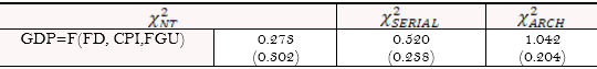 Both P-values in the three above diagnostic measures are negligible. Therefore, the data is said to be free of serial correlation and heteroscedasticity; also, the normality test indicates that the data is normally distributed.