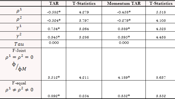 Table 6 below displays the Threshold Autoregressive (MTAR and TAR) models. We approximate the M-TAR by changing the differential speed. With HQC vectors showing TAR and M-TAR versions having an optimum latency of 2. BIC and AIC both demonstrate that the momentum concept is better suited to Nigeria. The findings of the M-TAR and the TAR showed that we can reject the null hypothesis of p1 = p2 = 0 at the 1% significance level. As a result, inflation, financial development, financial globalization uncertainty and economic growth are asymmetrically co-integrated. The research tests the null hypothesis with standard F-statistics (Enders & Granger, 1998).