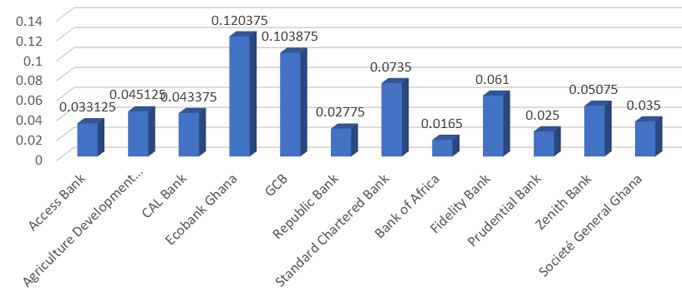The average market share of banks used for the study for the period 2011 to 2018 is presented in Figure 1 above. It is observed that Ecobank Ghana has the highest market share (0.120375) followed by GCB Bank, Standard Chartered Bank, Fidelity, and Zenith bank in that order. Bank of Africa records the lowest share of the market (0.0165) for the period.