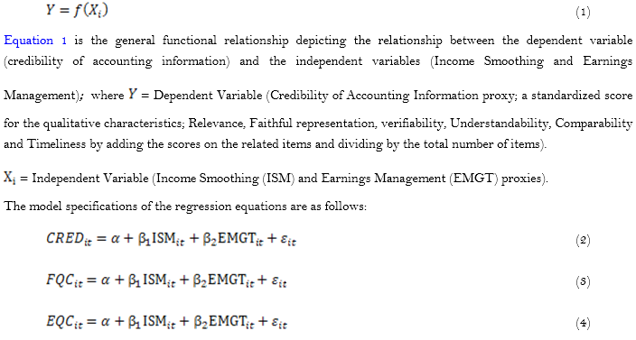 Equation 4 depicts the regression model, estimating the impact of income smoothing and earnings management on enhancing quality of accounting information.
