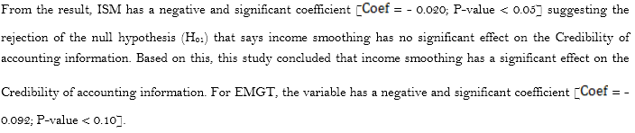 The study expected that income smoothing and earnings management practices impact on the credibility of financial statements, hence the a priori expectation is represented thus β1-β2 < 0 = Negative.