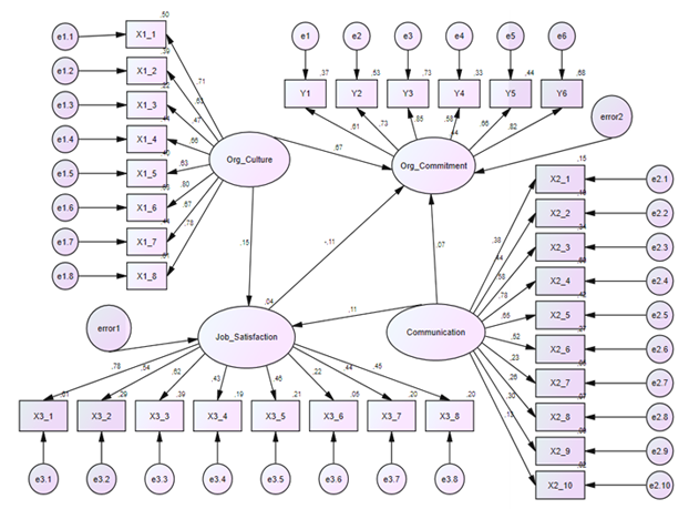 This study aims to obtain factual data and information that is valid and true and can be trusted about the influence of organizational culture, communication, and job satisfaction on the organizational commitment of lecturers at the Yayasan Pendidikan Borobudur. This research was conducted using a quantitative research approach, using a survey method, covering survey activities, testing instruments through validity, and reliability testing, as well as collecting and processing research data. The sample in this study was 114 permanent lecturers at the Yayasan Pendidikan Borobudur. The measurement in this study was carried out by giving the value of each question item from all variables. Measuring the value given in each question using the "Likert Scale". Data derived from the distribution of questionnaires carried out an analysis of research requirements, namely: The Goodness of Fit test, the Assessment of Normality test, and the Malahanobis Distance test. Data analysis techniques using Structural Equation Modeling analysis. Based on the results of research analysis: 1) there is an influence of Organizational Culture (X1) on Job Satisfaction (X3) of 0.154 2) There is an influence of Communication (X2) on Job Satisfaction (X3) of 0.109; 3) There is an influence of Organizational Culture (X1) on Organizational Commitment (Y) of 0.669; 4) There is an influence of Communication (X2) on Organizational Commitment (Y) of 0.069; 5) There is an influence of Job Satisfaction (X3) on Organizational Commitment (Y) of -0.111.