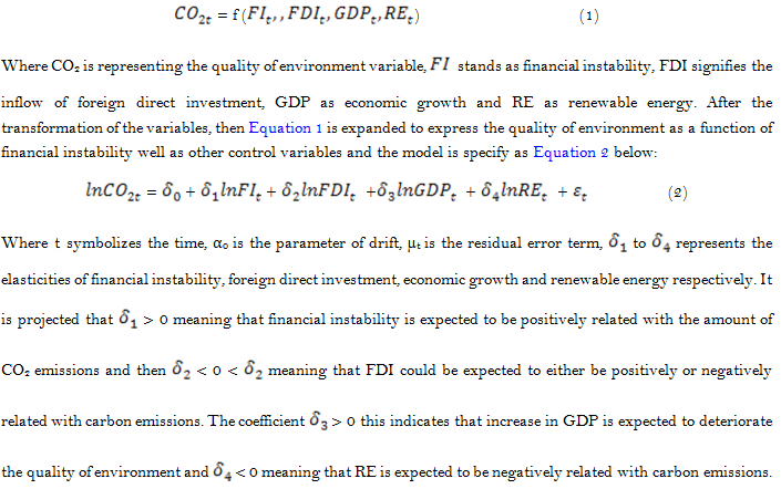 The focus of this research is to examine the relationship between financial instability and the Nigeria's state of environmental quality. For estimation of the model, we relied on Jakada, Mahmood, Ahmad, Faruq, and Mustapha (2020) and Baloch et al. (2018). The model specification is as follow: