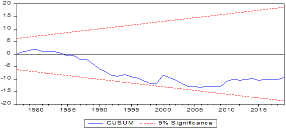 However, CUSUM (Cumulative Sum of Recursive Residuals) and CUSUMQ (Cumulative Sum of Square of Recursive Residuals) (Cumulative Sum of Square of Recursive Residuals) have been used for stability testing in order to ensure the robustness and stability of the model parameters. In the two test graphs shown in Figures 1a and 1b below, with regard to the stability of the parameters, the decision rule was based on the position of the CUSUM and CUSUMQ graphs. As provided, the stability tests of both CUSUM and CUSUMQ are considered stable and consistent since the models fall within the critical limits at the significance level of 5 percent.