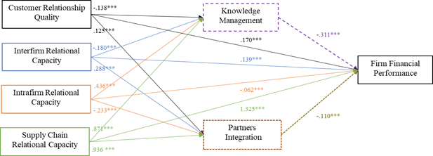 Relational Capabilities (RC) appear are valuable capabilities not only for performance but also to generate profitability. In this vein, this study performed a meta-analytic investigation of RC dimensions influencing firm financial performance. It also examined the role of mediating and moderating effects of knowledge management and partners integration influencing this association. From a meta-analytic procedure, 54 empirical studies were examined through random-effects model of Pearson’s correlations as the effect size and a meta-analytical regression analysis (MARA) to examined moderation effects and meta-analytical structure equation modeling (MASEM) to examined mediation effects. Our findings confirm that firm financial performance is impacted directly and positively by RC itself excepting by the intrafirm relational capacity dimension. We also find that knowledge management and partner integration do not mediate positively the effect RC on firm financial performance. Further, RC dimensions effects on firm financial performance vary positively and negatively across partner integration and knowledge management moderation effects.