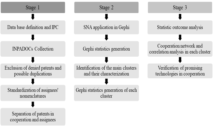 This study has a qualitative and quantitative nature that analyzing patents database in high analytics information technologies (HAI) granted to companies, governments and Science and Technology Institutions (STIs) represented by institutes, agencies, research centers, foundations, laboratories, and universities. Patent metrics technique, as a technological production indicator, was associated with cooperation networks analysis expecting to present an overview of HAI patents scenario in essential technologies used by various business sectors. Methodological overview of stages followed are presented in Figure 1.