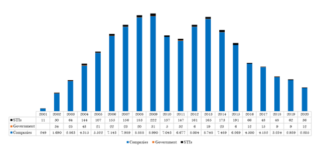 It was collected patents data from Derwent Innovation by Clarivate, that identified 59.481 International Patent Documentation (INPADOCs) or ‘patent families’ from 2001-2020. The patent data used were Publication Number, IPC Current, Title, Abstract, Assignee, Priority Country, INPADOC Legal Status, Publication Year, INPADOC Family Members, and Claims.
