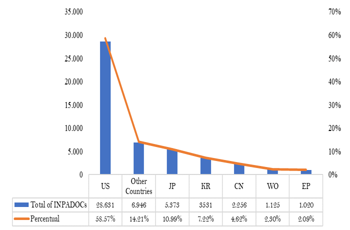 Examining the patents regarding markets of interesting (countries), findings show that 58.57% of the INPADOCs are in The United States (USA), 10.99% in Japan, 7.22% in South Korea, and 4.62% in China. Requests for protection at other countries represent 18.16% of the inventions, respectively. Patents’ publications appear preferably in home countries of the assignees Figure 3 .
