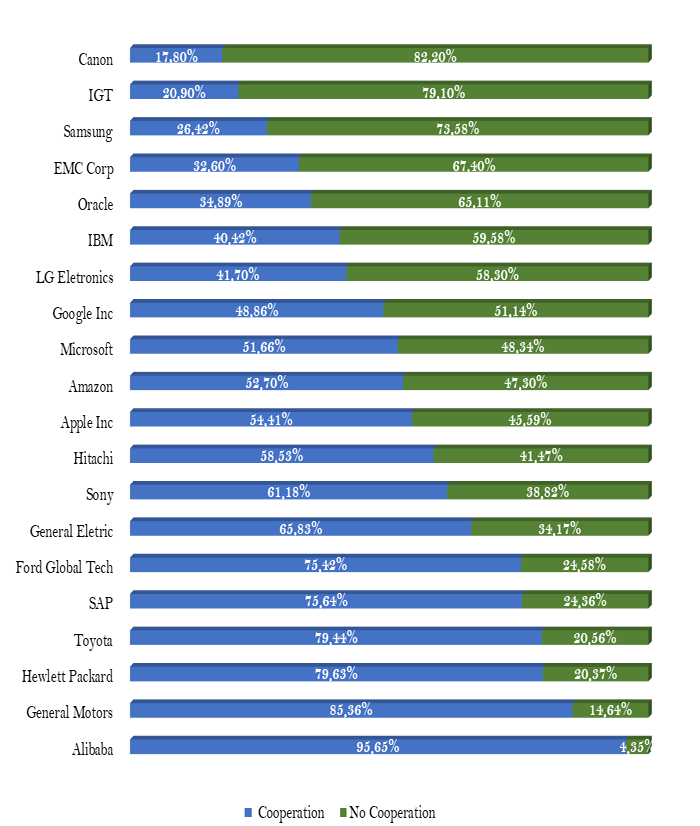 The top twenty assignees represented only by companies have 13,281 INPADOCs in proprietary technology or technologies in collaboration Figure 5. These results show that 54.6% of HAI developments are in cooperation and 45.05% in proprietary technology, i.e., in internal R&D. Alibaba, General Motors and Hewlett Packard, Toyota, System Analysis Program Development Company (SAP), and Ford Global Tech stand out, whose collaboration average is above 70%. However, three assignees Canon, International Game Technology Company (IGT) and Samsung show an inverse behavior with low cooperation with percentage above 70% for proprietary technology, which demonstrates their efforts in R&D (Research & Development). The other assignees maintain a balance between cooperation and proprietary technology.