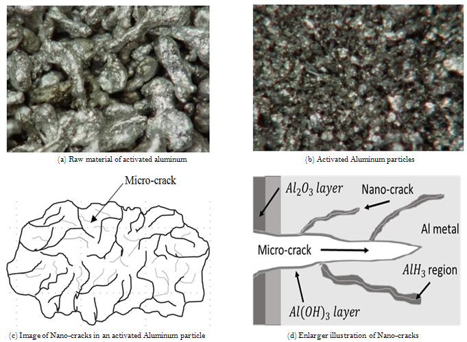 Activated aluminum particles are made from shredded aluminum sawdust or atomized aluminum. Firstly, shredded aluminum sawdust or atomized aluminum are milled by a special stone mill in cold water. After milling they are activated. The size of an activated particle equal to or less than 20[μm]. The above processes make many nano-cracks inside the activated aluminum particle. Fig 1 shows the pattern diagram of an activated aluminum particle. AlH3 is assumed to exist around the tip of nano-crack and expanded along each crack by corrosion reaction [6]; [7].