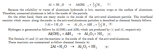 Because the crack is grown by the internal stress by the reaction, the reaction of hydrogen generation is spread in the whole of the activated aluminum particle.