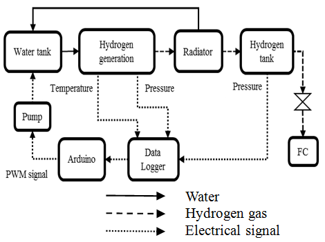 Fig 2 shows the outline of the portable FC system with the developed hydrogen generator. It consists of a FC (Chemix 100[W]), a water tank, an electrical pump (FEM1.09 KPSM-2, KNF Co. Ltd.), a reaction vessel, a buffer tank, a radiator, and a one-chip microcomputer (Arduino Uno). The pressure of the reaction vessel is measured in the buffer tank. The generated hydrogen is humid and is separated in the radiator. The separated water is recovered from the radiator to the water tank.