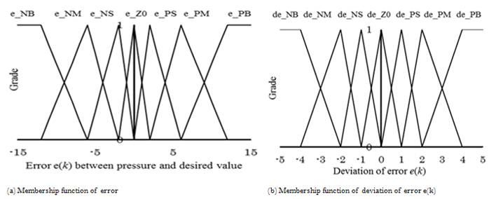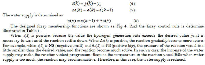 The output y(k) is chosen as the pressure of the reaction vessel which is measured in the buffer tank. The input u(k) is chosen as the water supply. The fuzzy rule for a fuzzy PI control to determine the water supply is determined as follows.