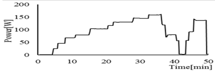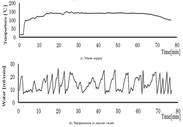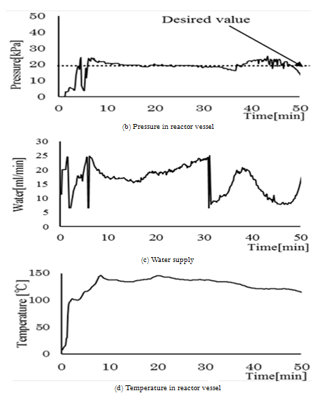 The variable resistor is connected to the developed portable FC system. In order to confirm the control performance to the change of the load, the value of the resistor is changed stepwise. Fig 5 shows one of the experimental results. In the figure, (a), (b), (c) and (d) is power of FC, pressure of the reaction vessel, water supply and temperature in the reaction vessel, respectively. In the figure, it is confirmed that the water supply increases due to the increase of the load. About 40 [min] after the start of the experiment, when the load is set small the pressure becomes high temporarily. After that, the water supply decreases and the pressure converges at 20[kPa]. Therefore, the developed portable FC system can be automatically regulated due to the change of the resistor.
