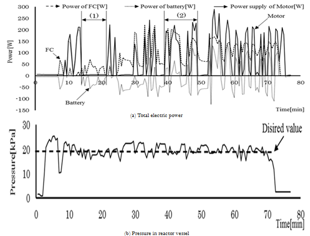 Fig 6 shows one of the result of driving experiments. The power of the FC, the lead battery and total electric power to be supplied to the motor controller are shown in Fig 6 (a). And Fig 6 (b), (c), and (d) is pressure of the reaction vessel, water supply and temperature in the reaction vessel, respectively. In the Fig 6 (a), the charging power is shown as negative value, and discharging power is shown as positive value. For example, the electric power from the FC is supplied to the lead battery during the stop of the FCV show as range (1) in Fig 6. When the electricity consumption of the motor increases the electricity is supplied to the motor from both the FC and the battery show as range (2) in Fig 6. In the case of the driving experiments, it is confirmed that the portable FC system supplies electricity power to the motor controller and the battery by regulating the water supply according to the change of the driving state.